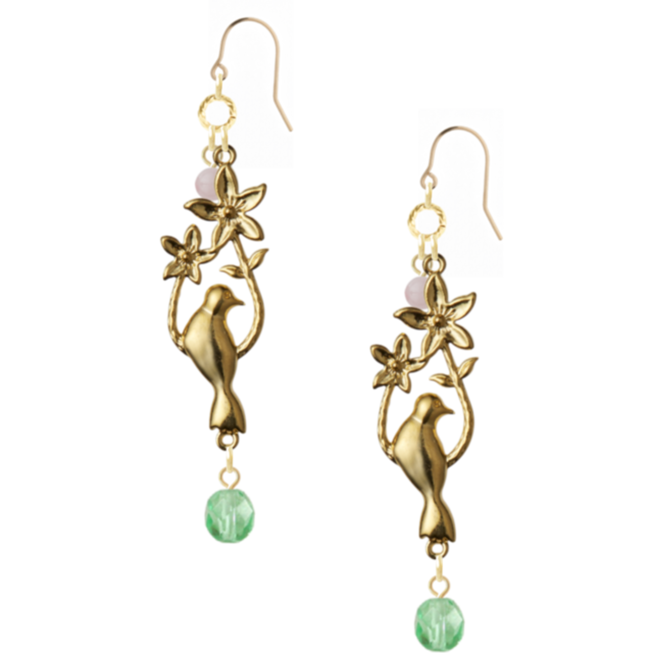 花の枝にとまる小鳥が愛らしい、ヴィンテージ調のピアス。