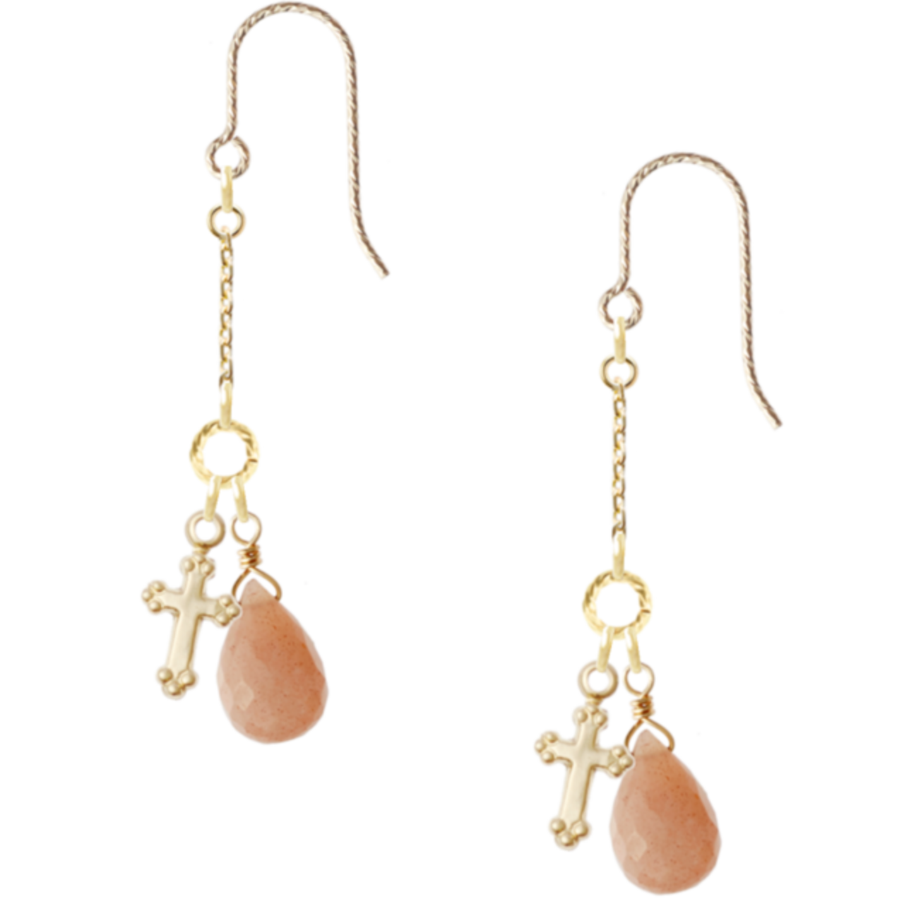 やわらかな光を秘めた「オレンジムーンストーン」と、小さなクロスチャームを合わせた、大人のためのピアス。