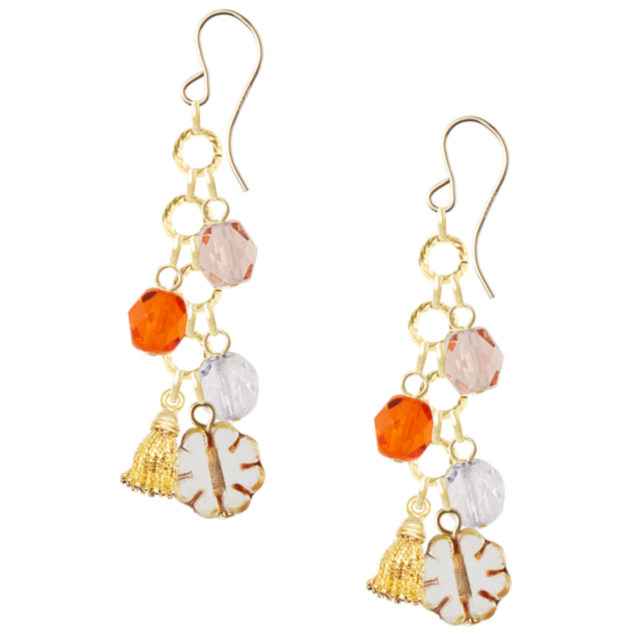 小さなフラワーモチーフとゴールドタッセルが、女性らしさと動きをプラス。